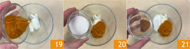 To prepare the pumpkin cream, combine the cream cheese, the remaining 160 g of pumpkin puree 19, sugar 20, and spice mix 21 in a bowl.