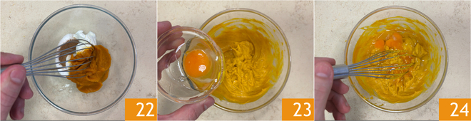 Mix everything 22, then add the egg 23 and mix again to incorporate it 34.