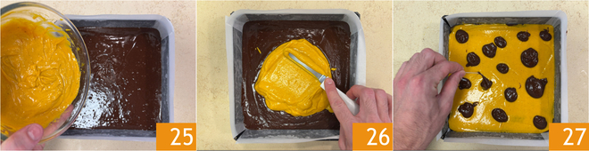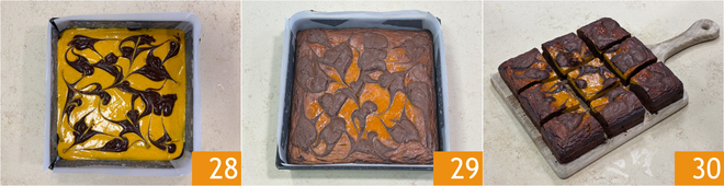 Pour the pumpkin cream into the pan 25 and level to cover the chocolate layer evenly 26. Now take the reserved brownie batter and distribute dollops on the surface, then create the marbled effect with a toothpick 27.