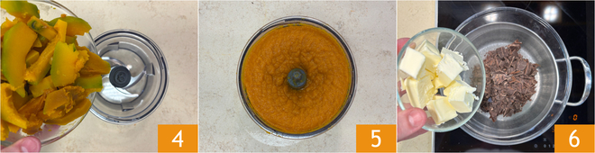 Let it cool, then transfer the pumpkin to a blender 4 and blend until you get about 250 g of smooth and homogeneous puree 5. Set aside. Now focus on the brownie batter: melt the chocolate with the butter in a double boiler 6.