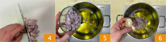 Slice the shallot thinly 4. In a pot, heat the oil, add the shallot 5 and the crushed unpeeled garlic 6.