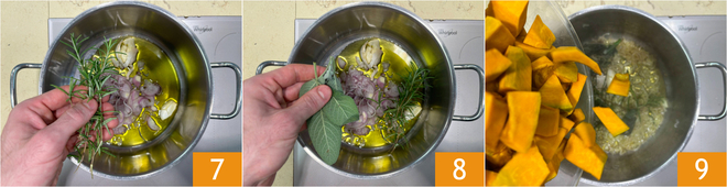 Add the rosemary 7, sage 8 and sauté for 2 minutes. Add the pumpkin 9 and cook for 5-7 minutes over high heat, stirring often.