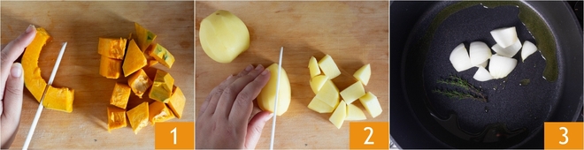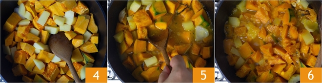 Add the pumpkin and potatoes, sauté for a minute 4, then cover with the hot broth 5. Lower the heat and simmer gently with the lid on for about 15-20 minutes. When the pumpkin and potatoes are soft, turn off the heat and let them cool slightly 6.