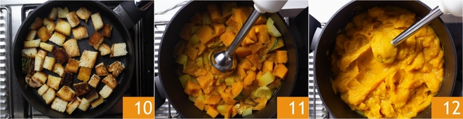 Toast the croutons, turning them often, they should be crispy and golden 10. At this point, blend the pumpkin and potatoes in the pan with an immersion blender 11 until you get a smooth and homogeneous consistency 12; if necessary, you can dilute the cream with a little broth.