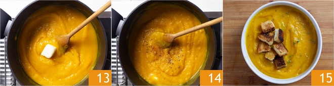 Turn the heat back on and add the butter, then stir to melt it 13. Finally, season with salt, pepper, and nutmeg 14. Serve your pumpkin and potato soup garnished with croutons 15!