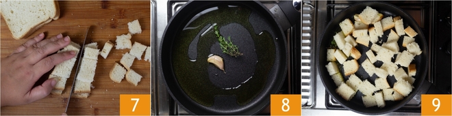 In the meantime, cut the sandwich bread into cubes to make the croutons 7. Heat the oil in a pan with the unpeeled garlic clove and thyme 8, then add the bread cubes 9.