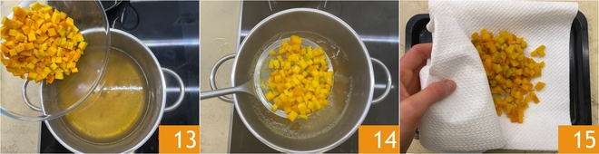 Briefly blanch the cubes in the hot broth for about 25 seconds 13. Drain 14 and gently pat dry 15.