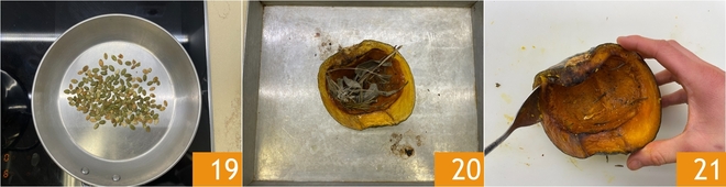 Set aside 19. Now take care of the oven-roasted pumpkin 20: scoop out the flesh with a spoon 21, collect it in a bowl and mash with a fork until you obtain a rustic purée.