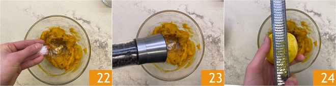 Season with salt 22 and pepper 23 and perfume with grated lemon zest 34.