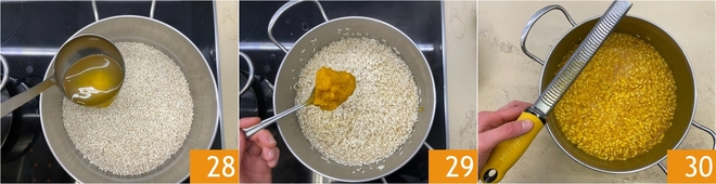 Start cooking by adding the hot vegetable broth little by little 28. After 5–6 minutes add the pumpkin purée 29 and continue cooking, stirring, until the risotto reaches the desired doneness. Remove from the heat and flavor again with lemon zest 30.