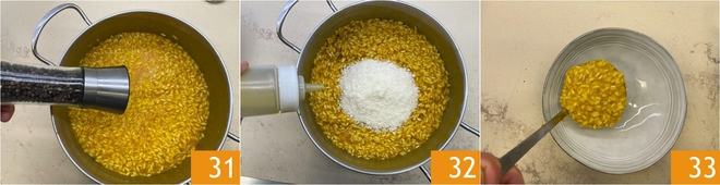 Season with pepper to taste 31 and finish by stirring in the grated cheese, the vinegar and extra virgin olive oil 32, mixing to obtain a creamy texture. Spoon the risotto onto plates 33.