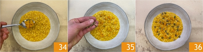 Top with the vinegar-marinated pumpkin cubes 34 and the toasted pumpkin seeds 35. Your pumpkin and seed risotto is ready to serve 36!