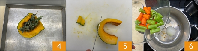 Place the pumpkin on a baking tray 4 and roast in the oven at 284°F for about 2 hours, until very soft. In the meantime, peel the reserved 3.5 oz slice of pumpkin 5; don't discard the peel, it will be used for the broth. In a saucepan, dry-toast the halved onion, then add the carrots and celery cut into large pieces 6.
