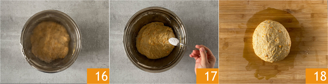 Then take the dough again 16 and mix it again with a spatula. Add the salt 17 and continue to knead in the bowl. Turn the dough out onto a lightly oiled work surface and form a round dough ball by giving some reinforcing folds 18.