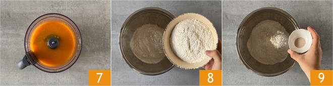Blend until you get a puree 7. In a large bowl, pour the 2 types of flour 8 and add the dry yeast 9.