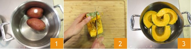 To prepare the pumpkin gnocchi, first boil the potatoes 1 for about 30-40 minutes, depending on their size. Meanwhile, cut the pumpkin into slices 2, remove the internal seeds, leaving the outer skin intact. Also, boil these; it will take about 20-25 minutes 3. Again, the time may vary depending on the type of pumpkin and the size of the slices; in any case, before draining it, check that it is soft.