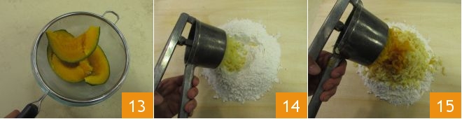In the meantime, the pumpkin will be cooked; drain it and leave it in the colander to remove excess water 13. When the potatoes are also cooked, drain them as well. Then, pour the flour onto a work surface and give it the classic fountain shape. Mash the warm potatoes in the center 14 and also mash the pumpkin after removing the outer skin 15.