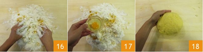 Knead with your hands 16 and add the egg 17. Knead again until you have obtained a homogeneous mixture 18.