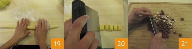 Then take a portion of the dough and create a rope 19 from which you will cut pieces about 0.8 inches 20. Continue this way until you finish the dough, placing the gnocchi on a tray sprinkled with flour. Put a pot full of water on the fire that will be used for cooking the pasta; bring it to a boil and, in the meantime, coarsely chop the hazelnuts 21