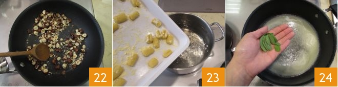 and toast them in a pan 22. As soon as the water starts to boil, salt it, drop the gnocchi, and cook them until they rise to the surface. In the meantime, in another pan, melt the butter with the sage 34
