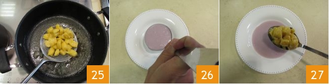 and as the gnocchi are ready, drain them into the condiment 25. Continue in this way until they are finished. In the meantime, take back the purple potato cream and heat it; you can add a little milk or cream if necessary. All that remains is to plate. Place a ladle of purple potato cream on a plate 26, lay a portion of gnocchi on top 27,