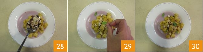 some toasted hazelnuts 28, and a few sage leaves 29. Serve the gnocchi on purple potato cream while still hot 30!
