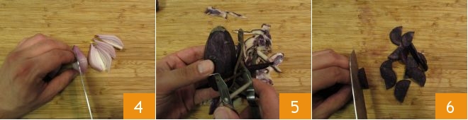 In the meantime, make the purple potato cream. Peel the shallot and divide it into 8 4. Peel the potatoes 5, cut them lengthwise, and then into thin slices 6.