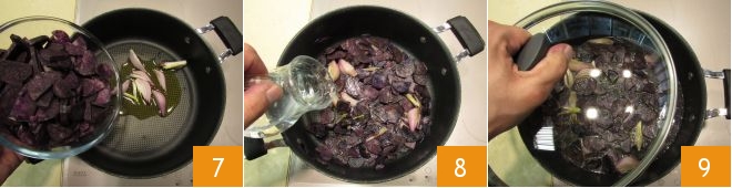 In a hot saucepan, add 1 tablespoon of oil, add the shallots and potatoes 7, and let them toast for a couple of minutes. Cover with water 8, and add salt. Then, cover with a lid 9 and let it cook for another 6 minutes.