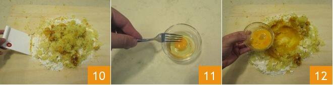 Work the dough as quickly as possible, using a dough scraper to compact the ingredients 10. Then beat an egg 11 and, after shaping the dough into a well, add the egg to the center 12.