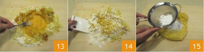 Mix the egg into the dough with a fork 13 and work it quickly with a dough scraper 14, shaping it into a dough ball. Sift cornstarch over it 15.