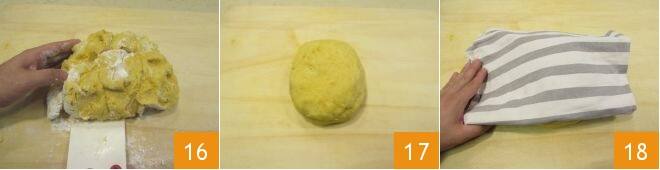 Mix in the cornstarch quickly with a dough scraper 16 and shape the dough into a sphere 17, which you will cover and let rest at room temperature with a cloth 18 for about 10 minutes. The dough should be soft, not sticky. If it is sticky, we recommend adding cornstarch, not flour.