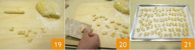 Then, take the dough again, dust the work surface with flour to prevent sticking, and take a small piece. Shape it into a stick, then cut it into small pieces about 1.5-2 cm 19. Repeat the process until all the dough is used up. Finally, take each piece of dough and, pressing it lightly on the tines of a fork or a gnocchi board, create the characteristic ridges 20. Place the ready-to-cook gnocchi on a tray covered with a floured cloth 21 and set them aside.