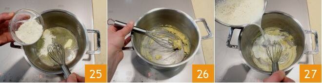 While heating the milk, in another small pot, melt the butter over low heat and add the flour gradually 25. During this process, keep whisking the ingredients to create a fairly thick and golden roux 26. Now add the milk 27, continuing to whisk.