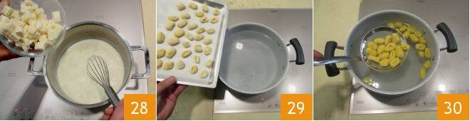 Then add the taleggio cubes 28 and melt them by stirring with a hand whisk. Let the mixture thicken over low heat, and when you achieve the right consistency, turn off the heat and pour it into a non-stick pan. At this point, cook the gnocchi in batches in plenty of salted water 29. When they float to the surface, they are ready: scoop them up with a slotted spoon 30 to drain excess water.