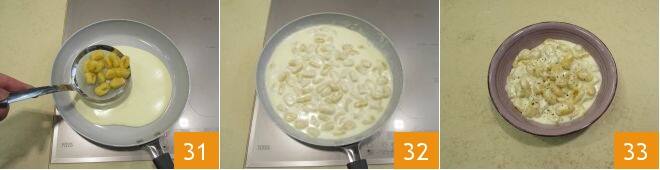 Pour them into the pan with the taleggio sauce 31 and mix them well 32 so that the gnocchi absorb the cheese fondue. Finally, plate your pumpkin gnocchi with taleggio sauce 33 and enjoy them while still hot!