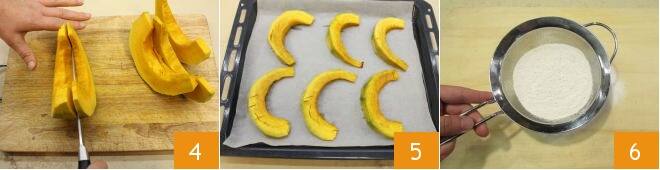 Cut it into thin slices 4 and place them well-spaced on a baking sheet lined with parchment paper. Bake in a preheated static oven at 400°F for 15-20 minutes 5. This process will dry the pumpkin, making the subsequent dough preparation easier. Once ready, set it aside. Meanwhile, the potatoes will also be ready, peel them and proceed with making the gnocchi. Sift the flour onto the work surface 6 and shape it into a fountain, creating a well in the center.