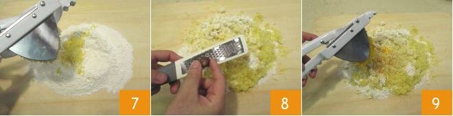 Press the warm potatoes through a ricer 7. Season with salt and pepper. Aromatize the dough with nutmeg 8 and press the warm pumpkin through the ricer as well 9.