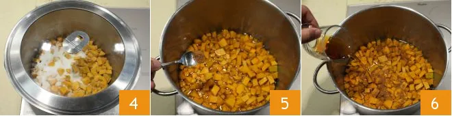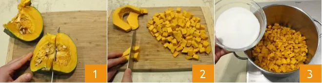 To make the pumpkin jam, cut the pumpkin into wedges 1, remove the seeds and the peel, then cut the flesh into small cubes 2. Transfer the pumpkin cubes into a pot and add the sugar 3.