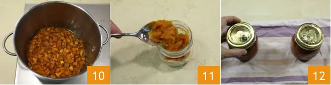 While the pumpkin jam is cooking, sanitize the jars and lids, following the guidelines of the Ministry of Health provided at the end of the recipe. When the jam is ready 10, pour it hot into the jars using a ladle 11, making sure to leave about half an inch of space from the rim of the jar. Screw the lids tightly but not too tight 12 and let them cool. The heat from the jam will create a vacuum seal, allowing for long-term storage. Once the jars have cooled, check if the vacuum seal is correct: you can press in the center of the lid, and if you do not hear the classic "click-clack," the vacuum seal has occurred. Your pumpkin jam is ready to be enjoyed!