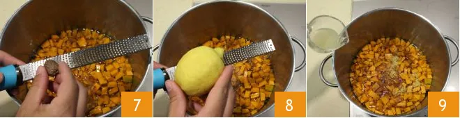 Add grated nutmeg 7, lemon zest 8, and also 1.4 oz of filtered lemon juice 9, cook the pumpkin for about 1 hour over low heat.