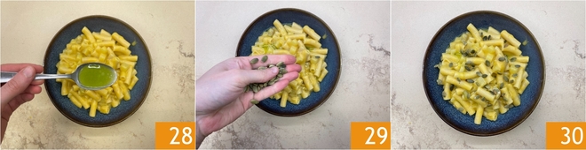 Cook by adding enough vegetable broth or hot water to cook the pasta 25, remove the bay leaf, and stir occasionally. Blend with butter 26 and grated Grana Padano DOP 27.