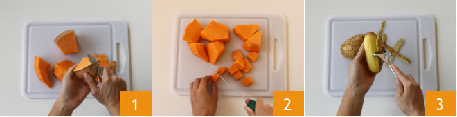 To prepare the pumpkin puree, start by cleaning it to get 700 g (1.54 lbs) of flesh. Cut it into slices and remove the skin 1, then cut it into cubes 2. Do the same with the potatoes by peeling them first 3.