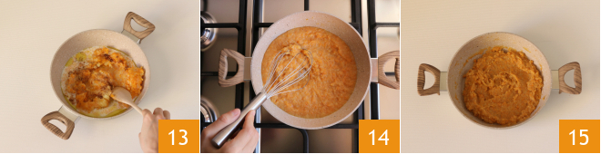 and make a puree 10. Transfer it to a pot and add the oil 11, the milk 12.