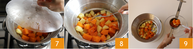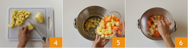 Then cut them into cubes 4. Place the pumpkin and potatoes in a steamer 5, set over a pot with boiling water, and cover with the lid 6.