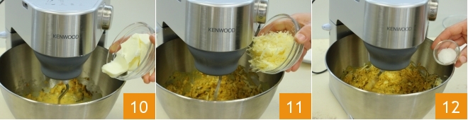 Once cooked, remove the pumpkin from the oven and let it cool. Once cooled, transfer it to a blender 7 and puree it. Transfer the pumpkin puree to the bowl of a stand mixer fitted with a dough hook 8 and add the rest of the ingredients: milk 9,