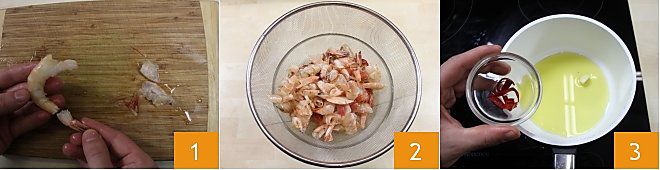 The first thing to do to prepare the pumpkin soup with shrimp is to clean the shrimp, detach the head and shell from the shrimp and remove the intestine 1, for more details click How to clean shrimp (Shrimp cleaning), set aside the shells 2 and use them to prepare the stock that will flavor the soup. In a pot, put the oil, garlic clove, and chili pepper, and fry for a couple of minutes 3