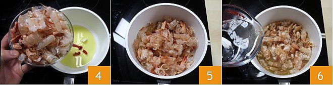 then add the shrimp shells and let them flavor in the oil 4, then add the white wine, let it evaporate, and add the water (5-6).