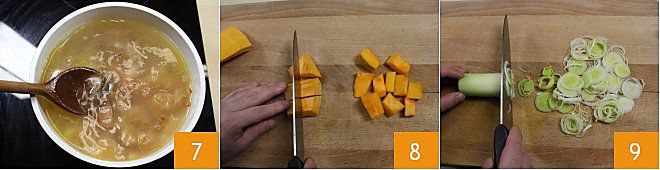 and let it cook for about half an hour. In the meantime, take care of the pumpkin, cut it into slices, remove the skin and cut it into small pieces, preferably all of the same size 8. Then clean the leek, removing the green parts and the outer leaves, then slice it 9.