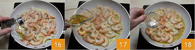 season them with salt and pepper 16, and deglaze with brandy 17 and white wine 18 and let it evaporate. Let them flavor for a couple of minutes, then turn off the heat.