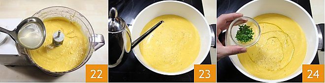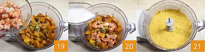 When the pumpkin is completely softened, transfer it to a mixer with the shrimp 19, add the cream 20, and blend until you get a smooth cream 21.
